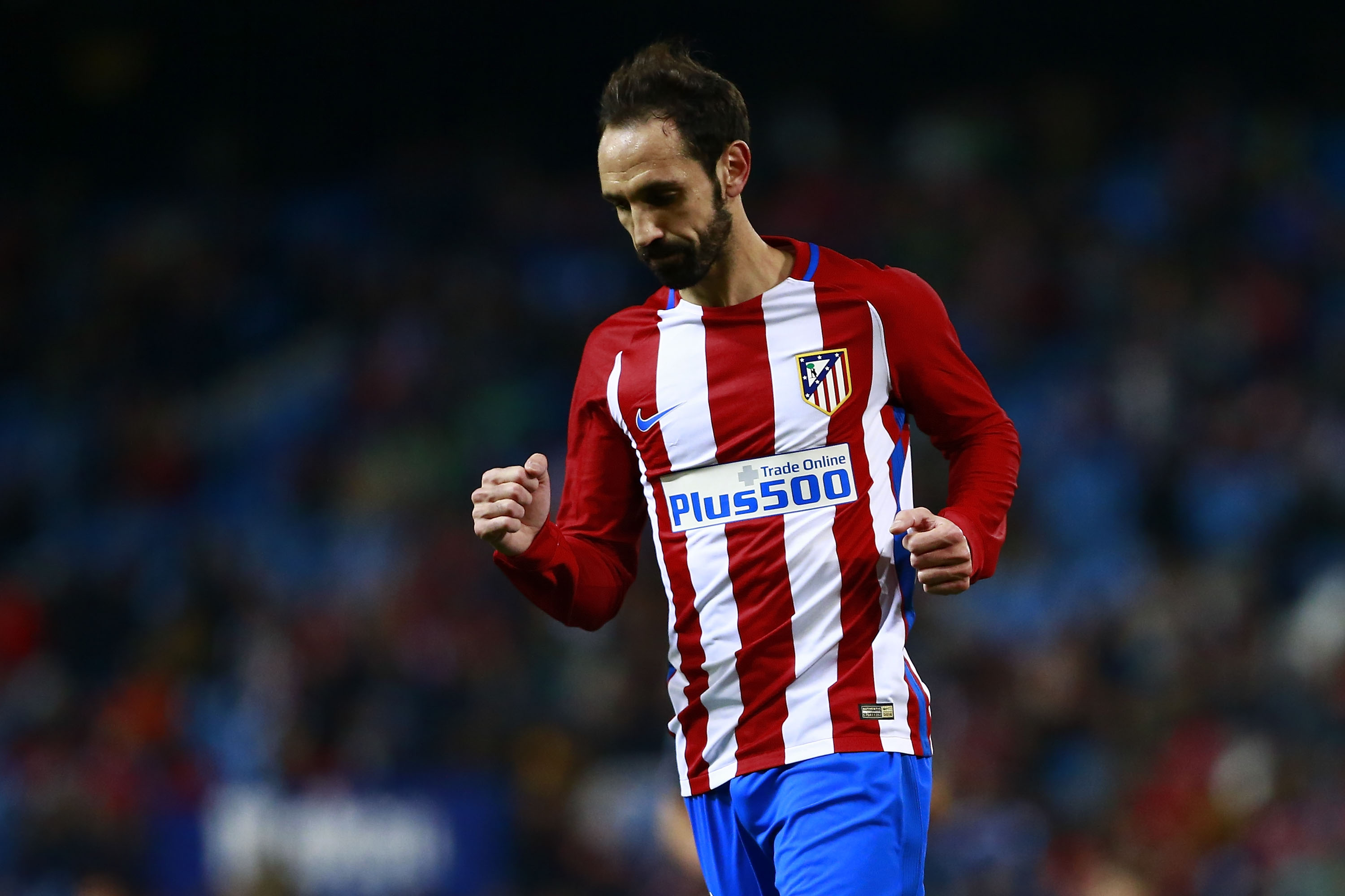 Atletico Madrid's defender Juanfran celebrates their third goal during the Spanish Copa del Rey (King's Cup) round of 32 second leg football match Club Atletico de Madrid vs CD Guijuelo at the Vicente Calderon stadium in Madrid on December 20, 2016. / AFP / JAVIER SORIANO (Photo credit should read JAVIER SORIANO/AFP/Getty Images)