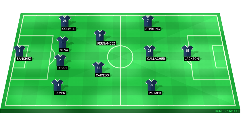 Predicted Chelsea XI: Sanchez; James, Disasi, Silva, Colwill; Caicedo, Fernandez; Palmer, Gallagher, Sterling; Jackson