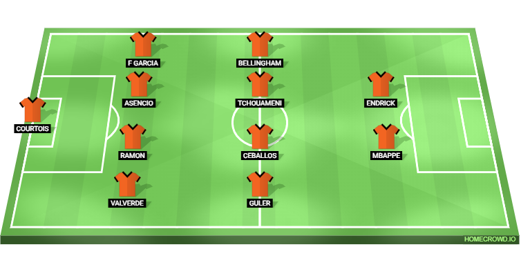 Predicted Real Madrid XI: Courtois; Valverde, Ramon, Asencio, Fran Garcia; Guler, Ceballos, Tchouameni, Bellingham; Mbappe, Endrick