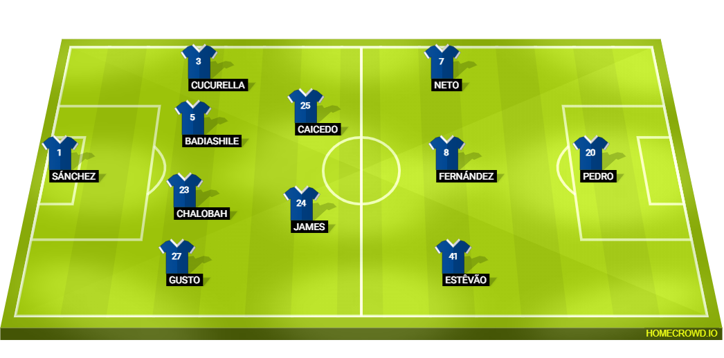 Predicted Chelsea XI: Sanchez; Gusto, Chalobah, Badiashile, Cucurella; James, Caicedo; Estevao, Enzo Fernandez, Neto; Joao Pedro