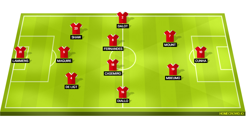 Predicted Manchester United XI: Lammens; de Ligt, Maguire, Shaw; Amad, Casemiro, Bruno Fernandes, Dalot; Mbeumo, Mount; Cunha