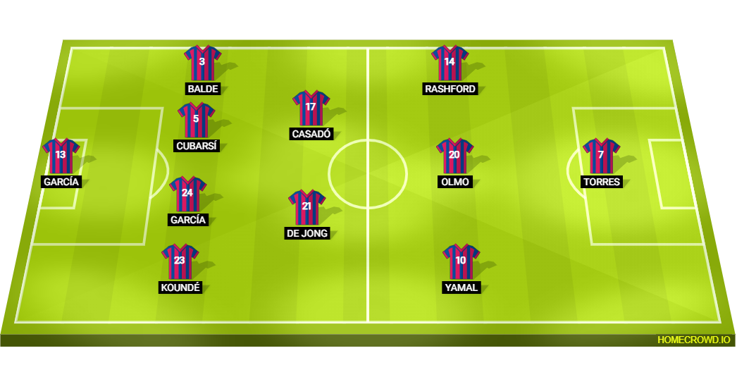 Predicted Barcelona XI: Joan Garcia; Kounde, Eric Garcia, Cubarsi, Balde; de Jong, Casado; Yamal, Olmo, Rashford; Torres