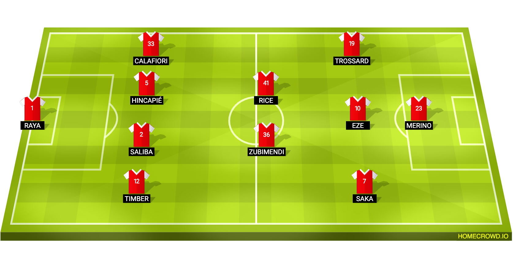 Predicted Chelsea XI: Raya; Timber, Saliba, Hincapie, Calafiori; Zubimendi, Rice; Saka, Eze, Trossard; Merino