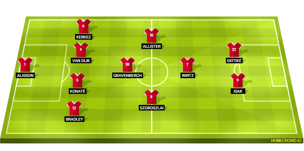Predicted Liverpool XI: Alisson; Bradley, Konate, van Dijk, Kerkez; Szoboszlai, Gravenberch, Mac Allister; Wirtz; Isak, Ekitike