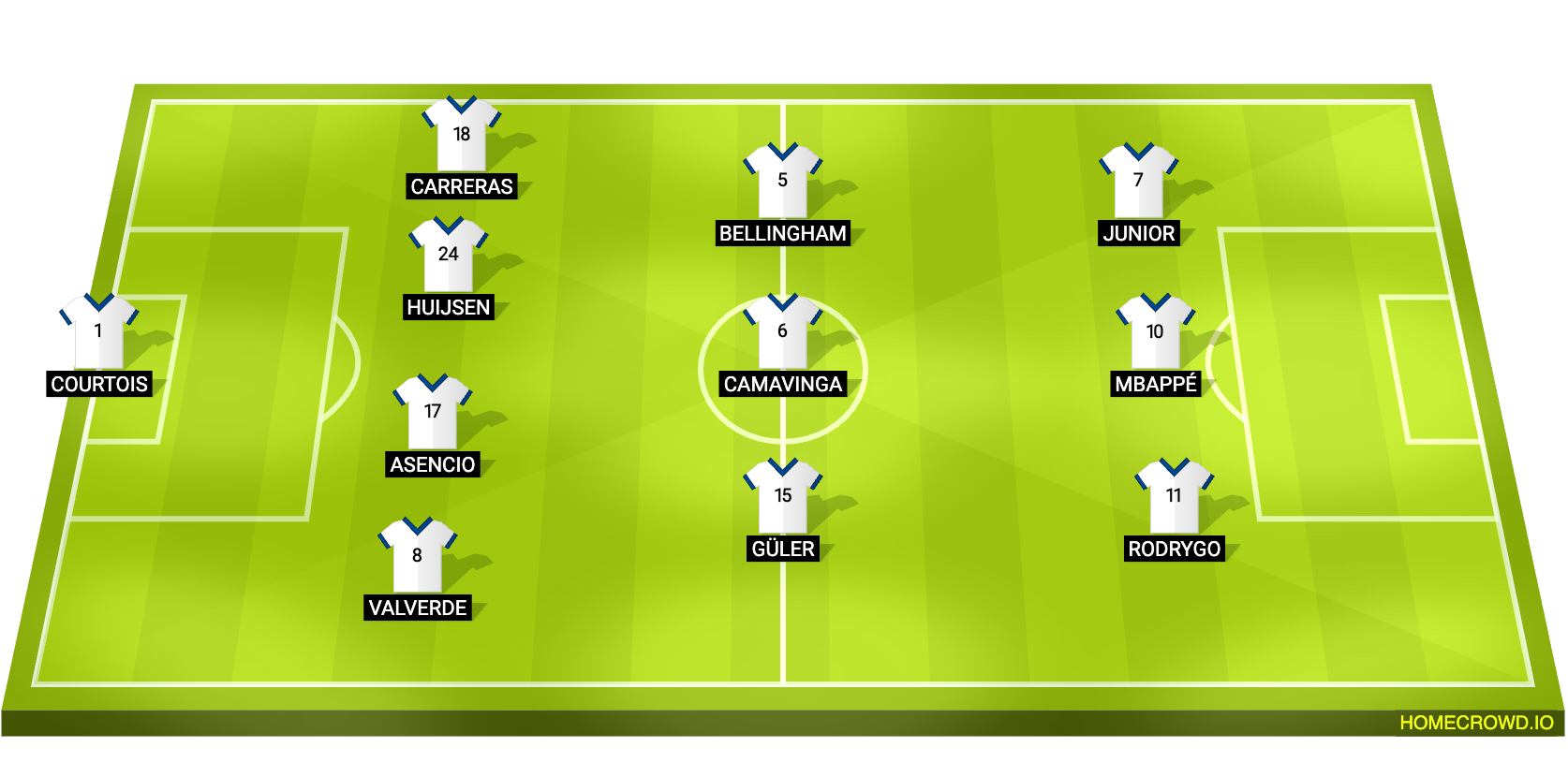 Predicted Real Madrid XI: Courtois; Valverde, Huijsen, Asencio, Carreras; Guler, Camavinga, Bellingham; Rodrygo, Mbappe, Vinicius Junior