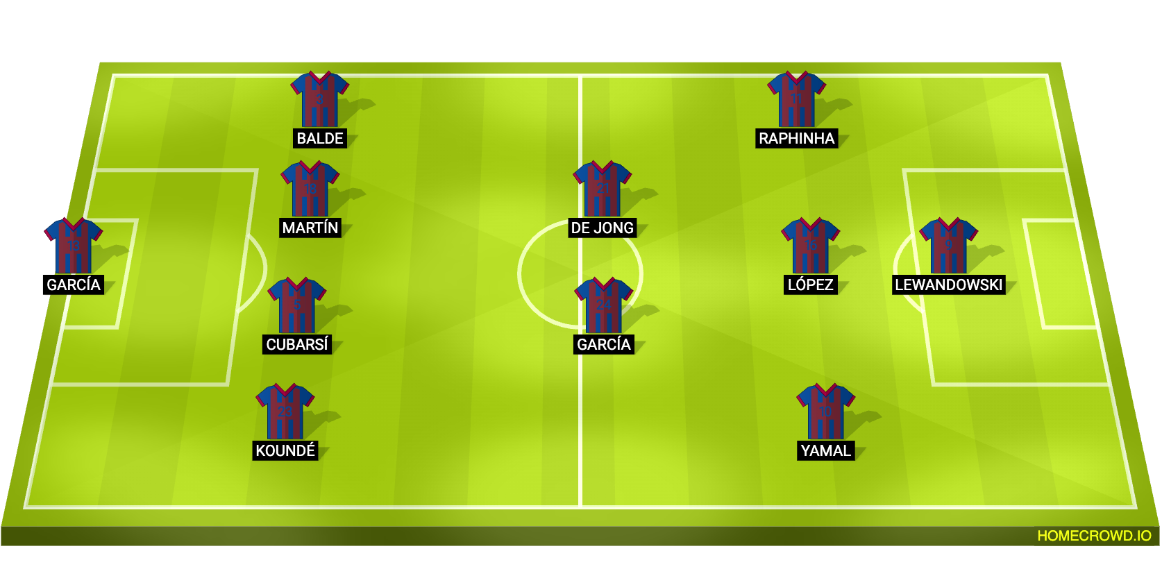 Predicted Barcelona XI: Joan Garcia; Kounde, Cubarsi, Martin, Balde; Eric Garcia, de Jong; Yamal, Fermin, Raphinha; Lewandowski