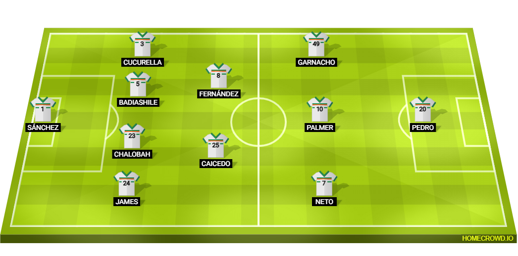 Predicted Chelsea XI: Sanchez; James, Chalobah, Badiashile, Cucurella; Caicedo, Fernandez; Neto, Palmer, Garnacho; Pedro