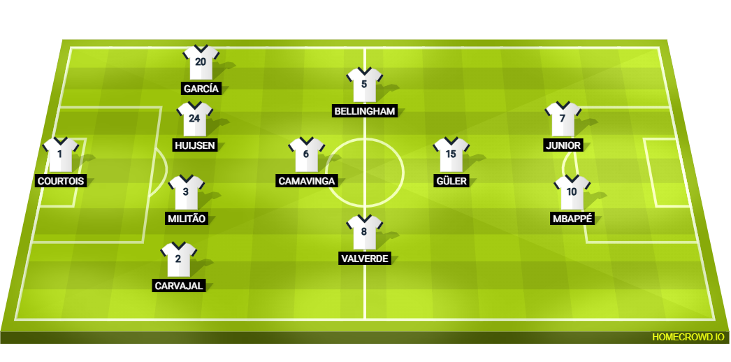 Predicted Real Madrid XI: Lunin; Carvajal, Militao, Huijsen, Fran Garcia; Valverde, Camavinga, Bellingham; Guler; Mbappe, Vinicius Junior