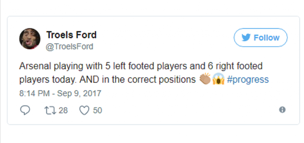 Arsenal playing with 5 left footed players and 6 right footed players today. AND in the correct positions ??? #progress