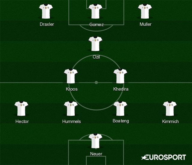 Predicted Starting XI (4-4-1-1): Neuer, Kimmich, Hummels, Boateng, Hector, Khedira, Kroos, Draxler, Muller, Ozil, Gomez
