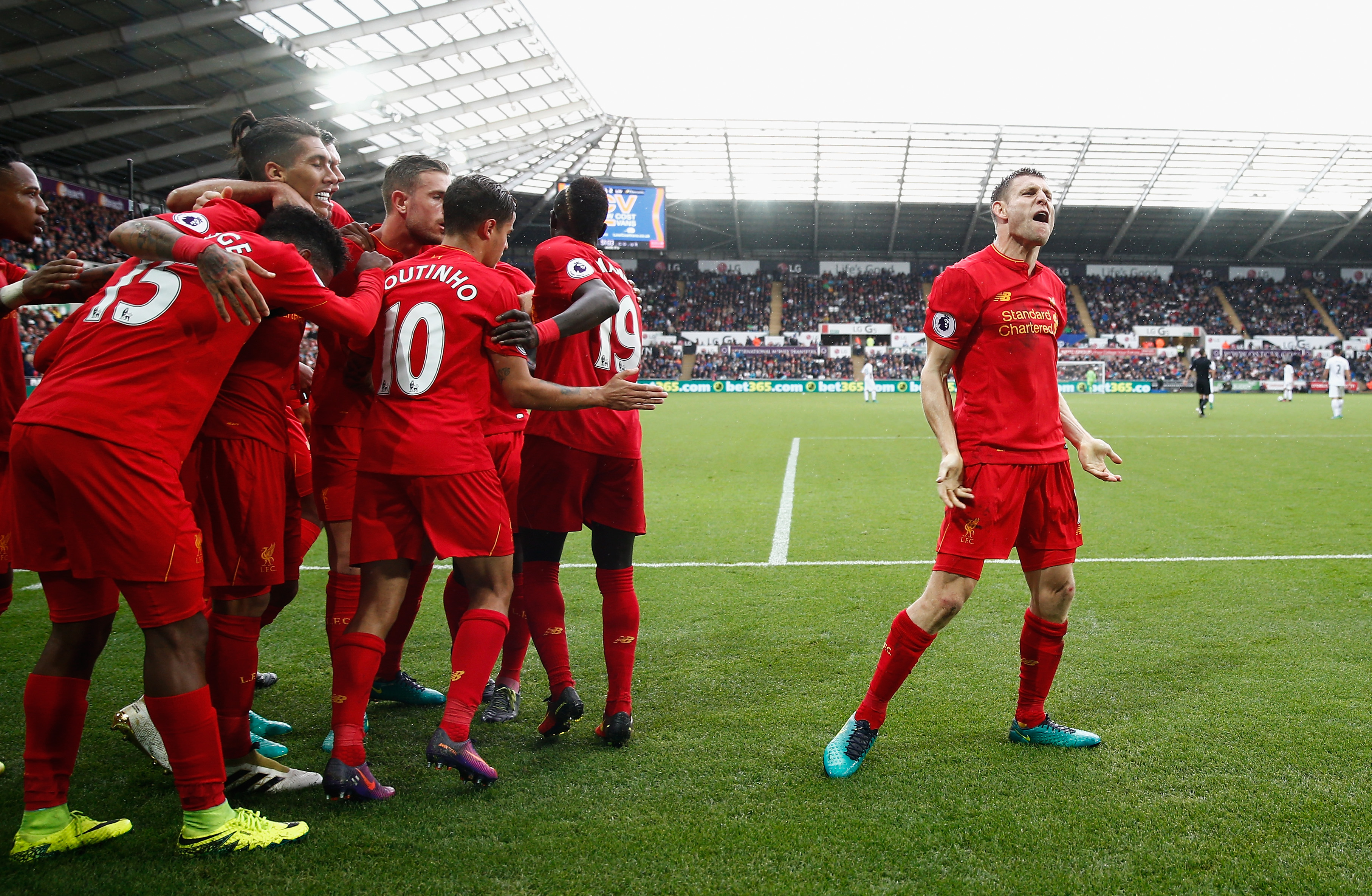 LIVERPOOL, ENGLAND - SEPTEMBER 24: James Milner of Liverpool (7) celebrates scoring his sides second goal with team mates during the Premier League match between Liverpool and Hull City at Anfield on September 24, 2016 in Liverpool, England. (Photo by Julian Finney/Getty Images)