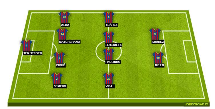Possible Starting XI (4-4-2): ter Stegen; Semedo, Pique, Mascherano, Alba; Vidal, Paulinho, Busquets, Denis Suarez; Messi, Luis Suarez