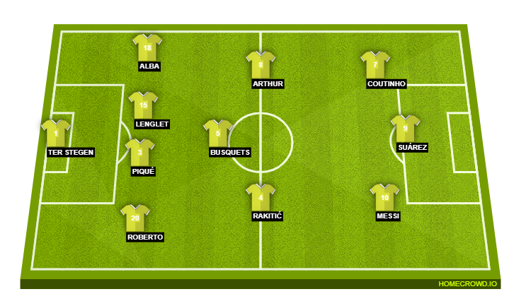 Probable Lineup (4-3-3): ter Stegen; Roberto, Pique, Lenglet, Alba; Rakitic, Busquets, Arthur; Messi, Suarez, Coutinho