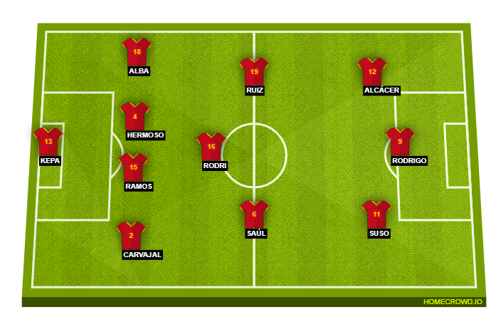 The Spain squad seems to be lacking players to play out wide in the three-man attacking trio, with Suso and Mikel Oyarzabal the only natural options. Hence, the pair pick themselves to flank the central striker, who should be Paco Alcacer, with Rodrigo being an option on the bench.