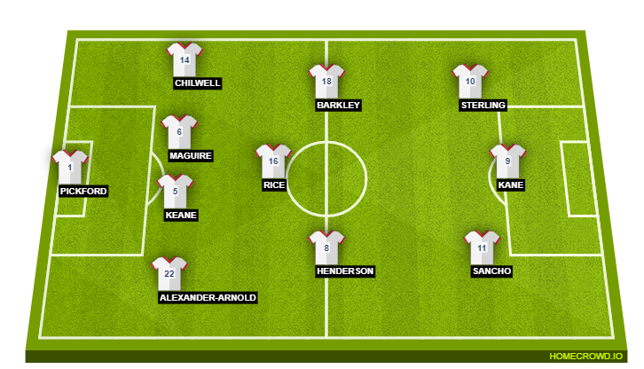 Probable Lineup (4-3-3): Pickford; Alexander-Arnold, Keane, Maguire, Chilwell; Henderson, Rice, Barkley; Sancho, Kane, Sterling