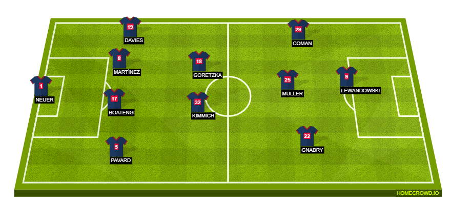 Probable Lineup (4-2-3-1): Neuer; Pavard, Boateng, Martinez, Davies; Kimmich, Goretzka; Gnabry, Muller, Coman; Lewandowski