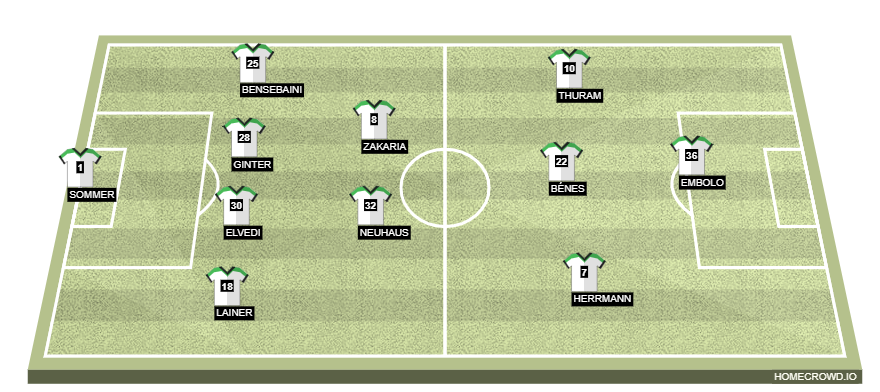 Probable Lineup (4-2-3-1): Sommer; Lainer, Elvedi, Ginter, Bensebaini; Neuhaus, Zakaria; Herrmann, Benes, Thuram; Embolo