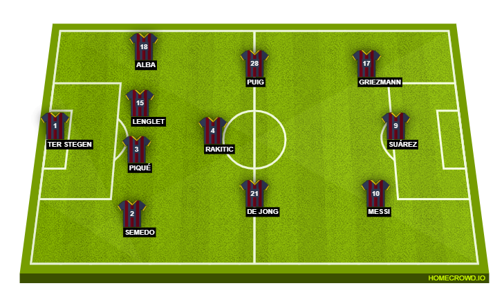 Probable Lineup (4-3-3): ter Stegen; Semedo, Pique, Lenglet, Alba; de Jong, Rakitic, Puig; Messi, Suarez, Griezmann