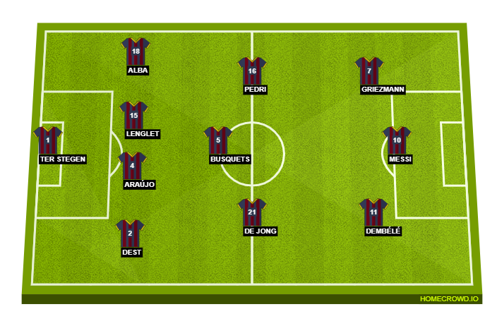 Probable Lineup (4-3-3): ter Stegen; Dest, Araujo, Lenglet, Alba; de Jong, Busquets, Pedri; Dembele, Messi, Griezmann