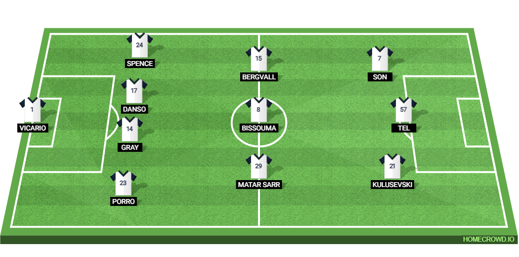 Probable Lineup (4-3-3): Vicario; Porro, Gray, Danso, Spence; Sarr, Bissouma, Bergvall; Kulusevski, Tel, Son