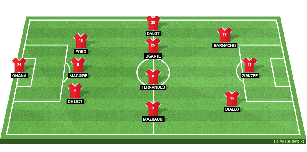 Probable Lineup (3-4-3): Onana; de Ligt, Maguire, Yoro; Mazraoui, Fernandes, Ugarte, Dalot; Diallo, Zirkzee, Garnacho