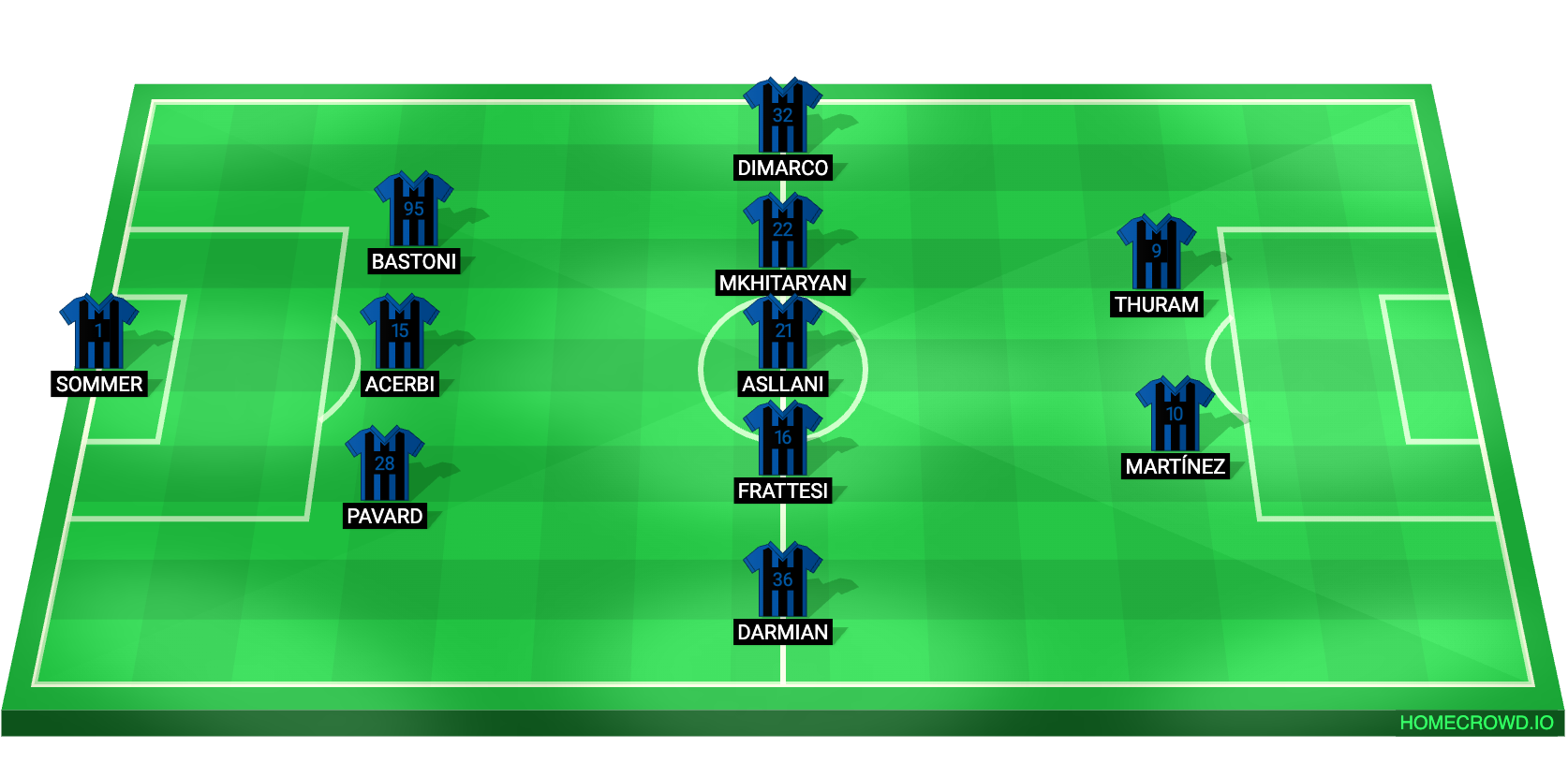Possible Lineup (3-5-2): Sommer; Pavard, Acerbi, Bastoni; Darmian, Frattesi, Asllani, Mkhitaryan, Dimarco; Thuram, Martinez