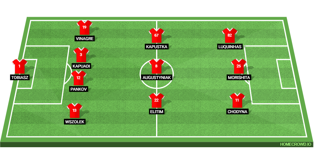 Probable Lineup (4-3-3): Tobiasz; Wszolek, Pankov, Kapuadi, Vinagre; Elitim, Augustyniak, Kapustka; Chodyna, Morishita, Luquinhas