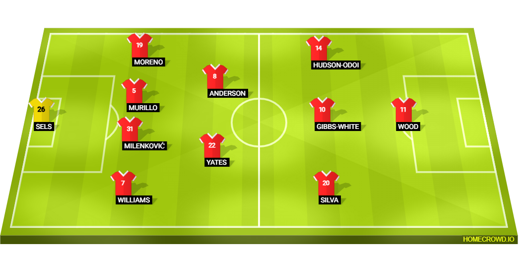 Probable Lineup (4-2-3-1): Sels; Williams, Murillo, Milenkovic, Alex Moreno; Yates, Anderson; Jota Silva, Gibbs-White, Hudson-Odoi; Wood