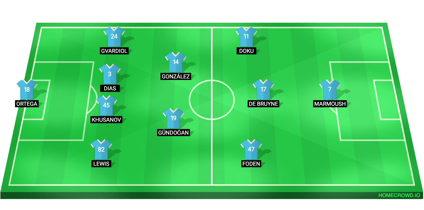 Probable Lineup (4-2-3-1): Ortega; Lewis, Dias, Khusanov, Gvardiol; Gundogan, Gonzalez; Foden, De Bruyne, Doku; Marmoush