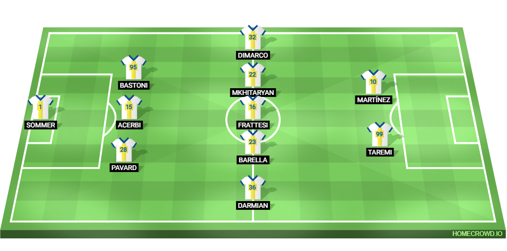Possible Lineup (3-5-2): Sommer; Pavard, Acerbi, Bastoni; Darmian, Barella, Frattesi, Mkhitaryan, Dimarco; Taremi, Martinez