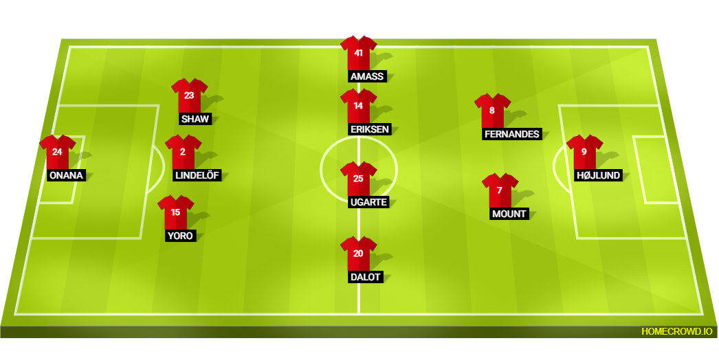 The wide duo will provide width in the final third and protect the centre-backs during the defensive phases. As for the midfield unit, Christian Eriksen should line up alongside Manuel Ugarte in the middle of the park. The tireless Bruno Fernandes will start again, joining Rasmus Hojlund and Mason Mount in the final third.