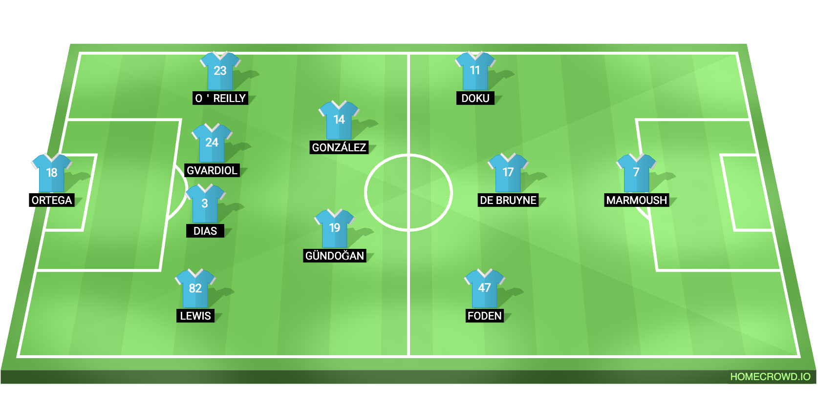Probable Lineup (4-2-3-1): Ortega; Lewis, Dias, Gvardiol, O’Reilly; Gundogan, Gonzalez; Foden, De Bruyne, Doku; Marmoush