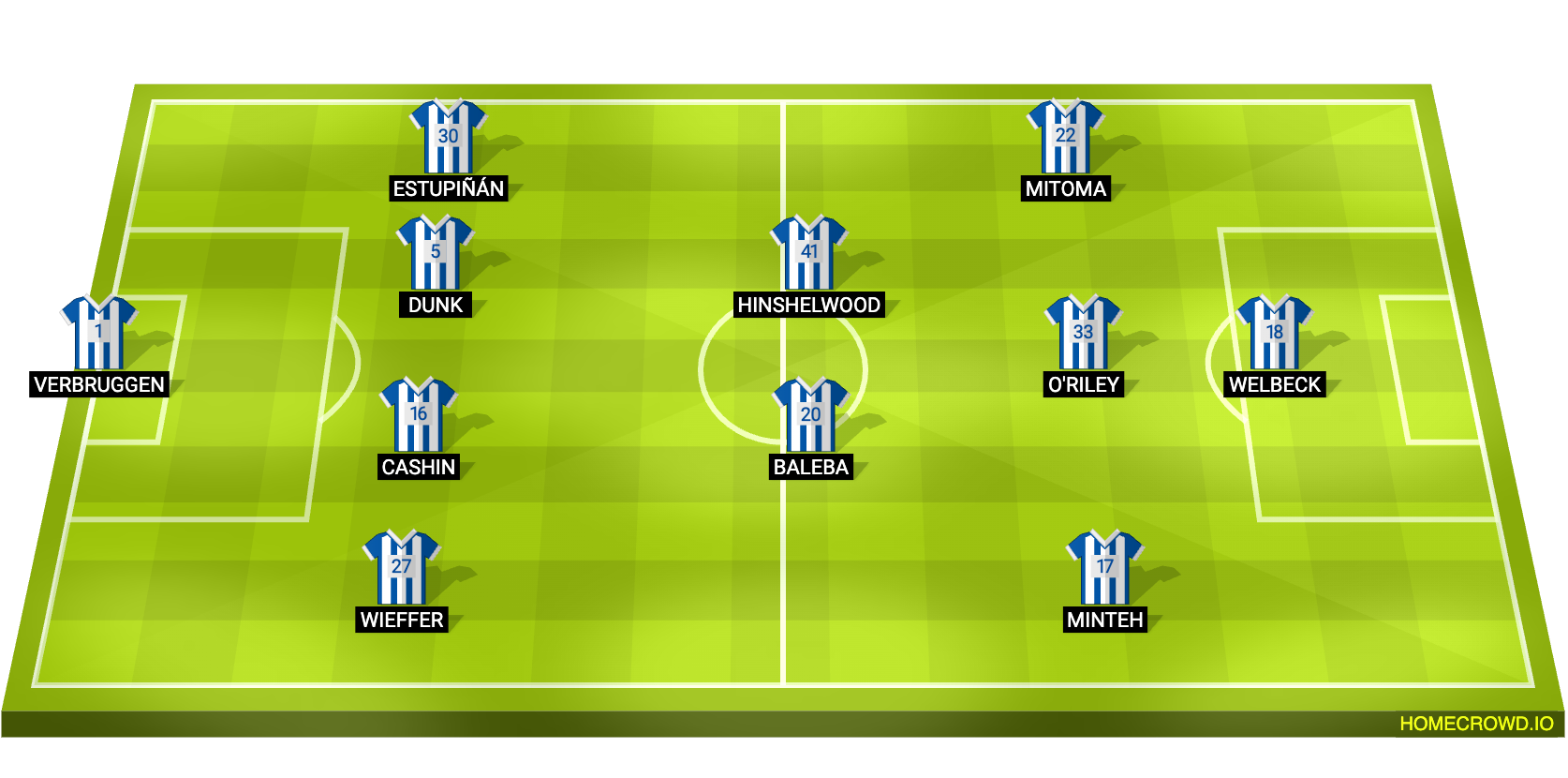 Probable Lineip (4-2-3-1): Verbruggen; Wieffer, Cashin, Dunk, Estupinan; Baleba, Hinshelwood; Minteh, O’Riley, Mitoma; Welbeck