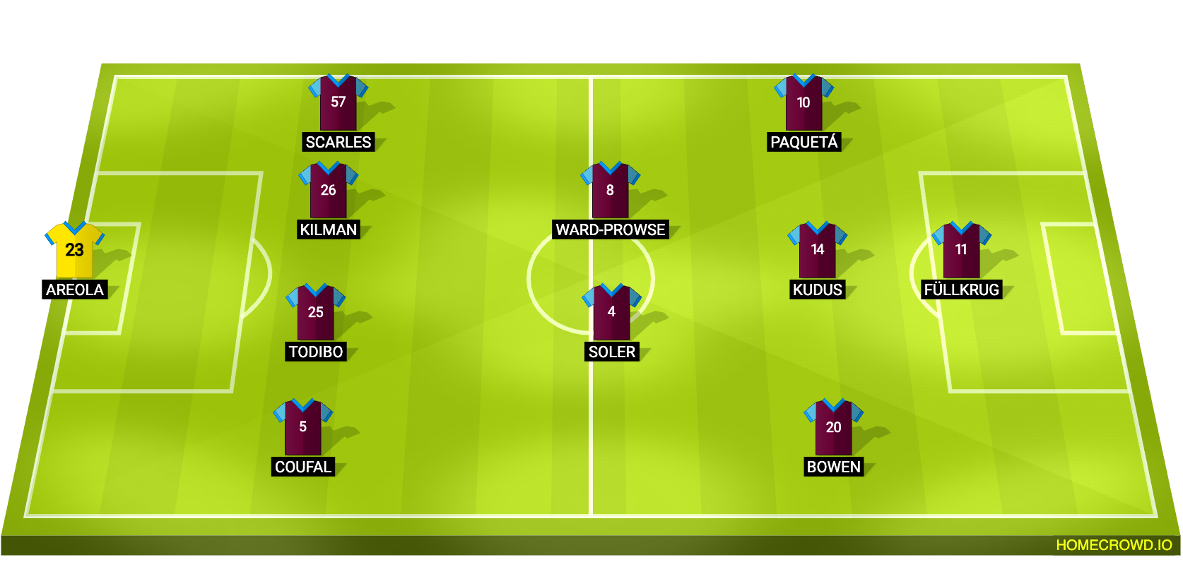 Probable Lineup (4-2-3-1): Areola; Coufal, Todibo, Kilman, Scarles; Soler, Ward-Prowse; Bowen, Kudus, Paqueta; Fullkrug