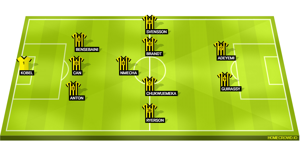 Probable Lineup (3-1-4-2): Kobel; Anton, Can, Bensebaini; Nmecha; Ryerson, Chukwuemeka, Brandt, Svensson; Guirassy, Adeyemi