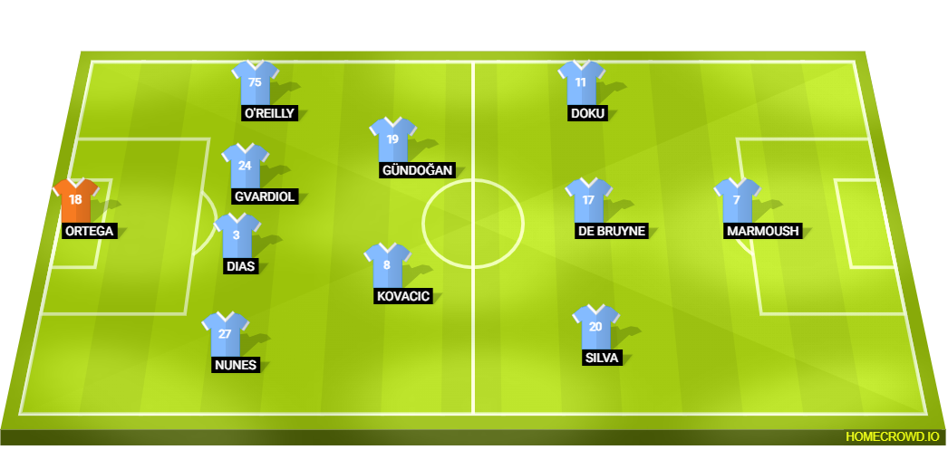 Probable Lineup (4-2-3-1): Ortega; Nunes, Dias, Gvardiol, O’Reilly; Kovacic, Gundogan; Silva, De Bruyne, Doku; Marmoush