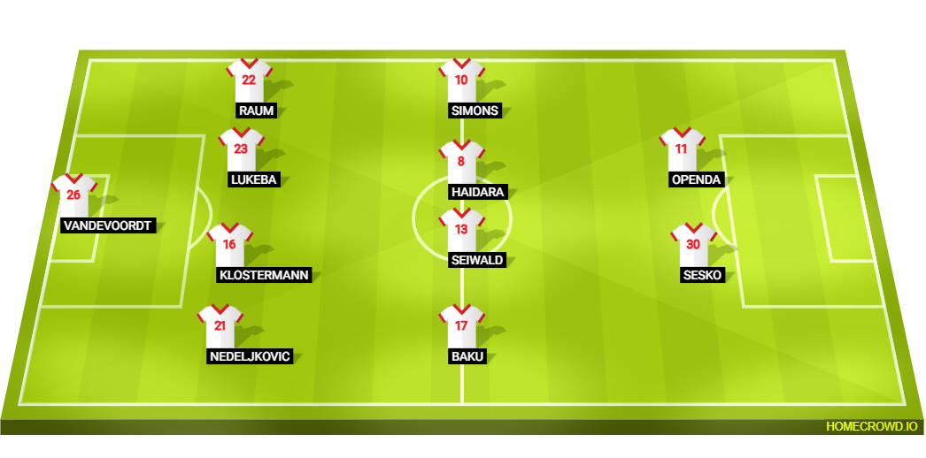 Probable Lineup (4-4-2): Vandevoordt; Nedeljkovic, Klostermann, Lukeba, Raum; Baku, Seiwald, Haidara, Xavi Simons; Sesko, Openda