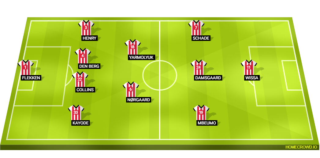 Probable Lineup (4-2-3-1): Flekken; Kayode, Collins, van den Berg, Henry; Norgaard, Yarmolyuk; Mbeumo, Damsgaard, Schade; Wissa
