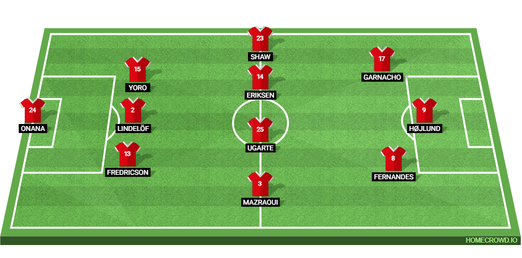 Probable Lineup (3-4-3): Onana; Fredricson, Lindelof, Yoro; Mazraoui, Ugarte, Eriksen, Shaw; Bruno Fernandes, Garnacho; Hojlund