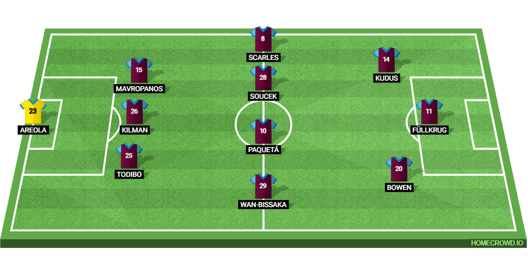 In midfield, the wing-back roles will be occupied by Aaron Wan-Bissaka on the right and Oliver Scarles on the left, with both players providing width and defensive cover. The central midfield duo will feature Lucas Paquetá and Tomáš Souček, combining technical skill and physicality to control the centre of the park.