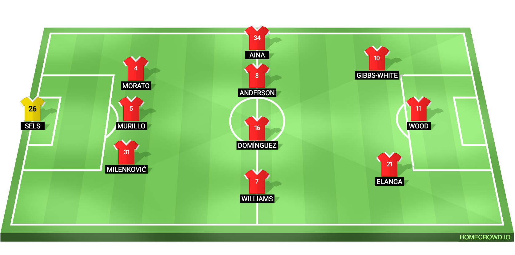 Probable Lineup (3-4-3): Sels; Williams, Milenkovic, Murillo, Morato, Yates; Dominguez, Anderson; Gibbs-White, Wood, Elanga
