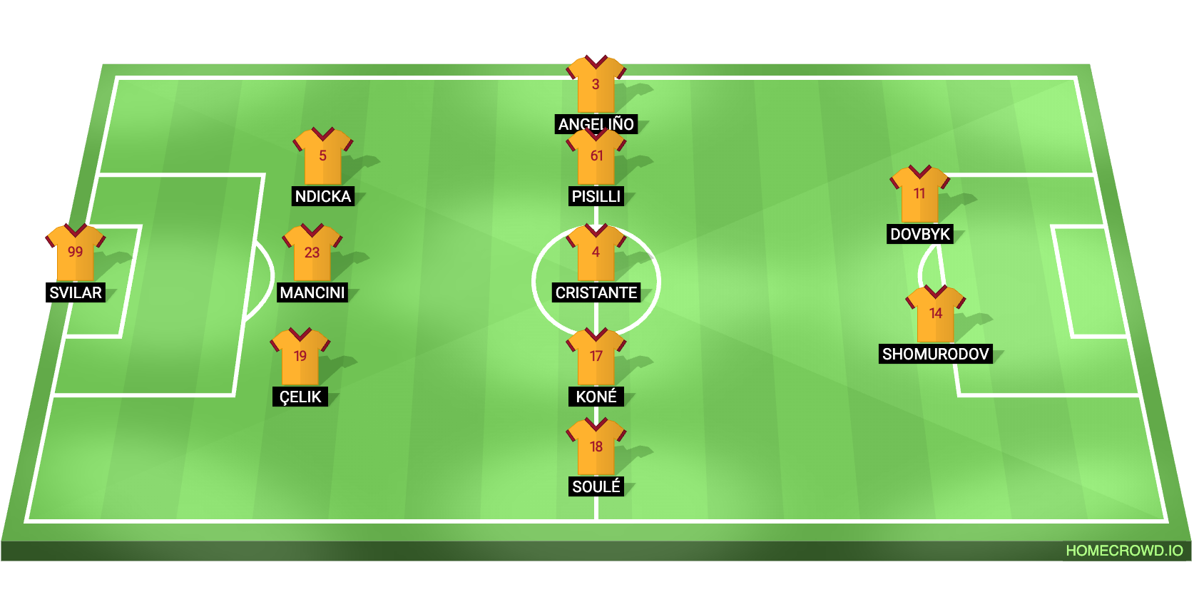 Probable Lineup (3-5-2): Svilar; Celik, Mancini, Ndicka; Soule, Pisilli, Kone, Cristante, Angelino; Dovbyk, Shomurodov