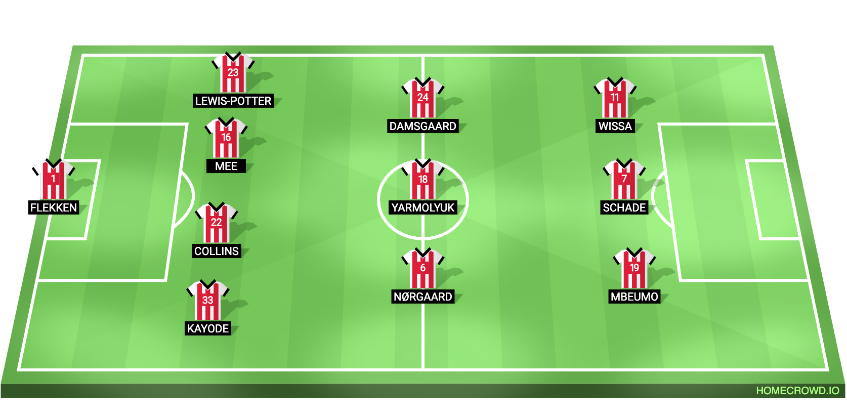 Probable Lineup (4-3-3): Flekken; Kayode, Collins, Mee, Lewis-Potter; Yarmoliuk, Norgaard, Damsgaard; Mbeumo, Schade, Wissa