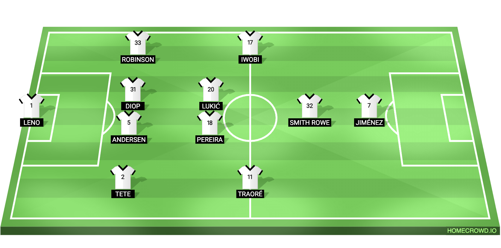 Probable Lineup (4-2-3-1): Leno; Tete, Diop, Andersen, Robinson; Lukic, Pereira; Traore, Smith Rowe, Iwobi; Jimenez