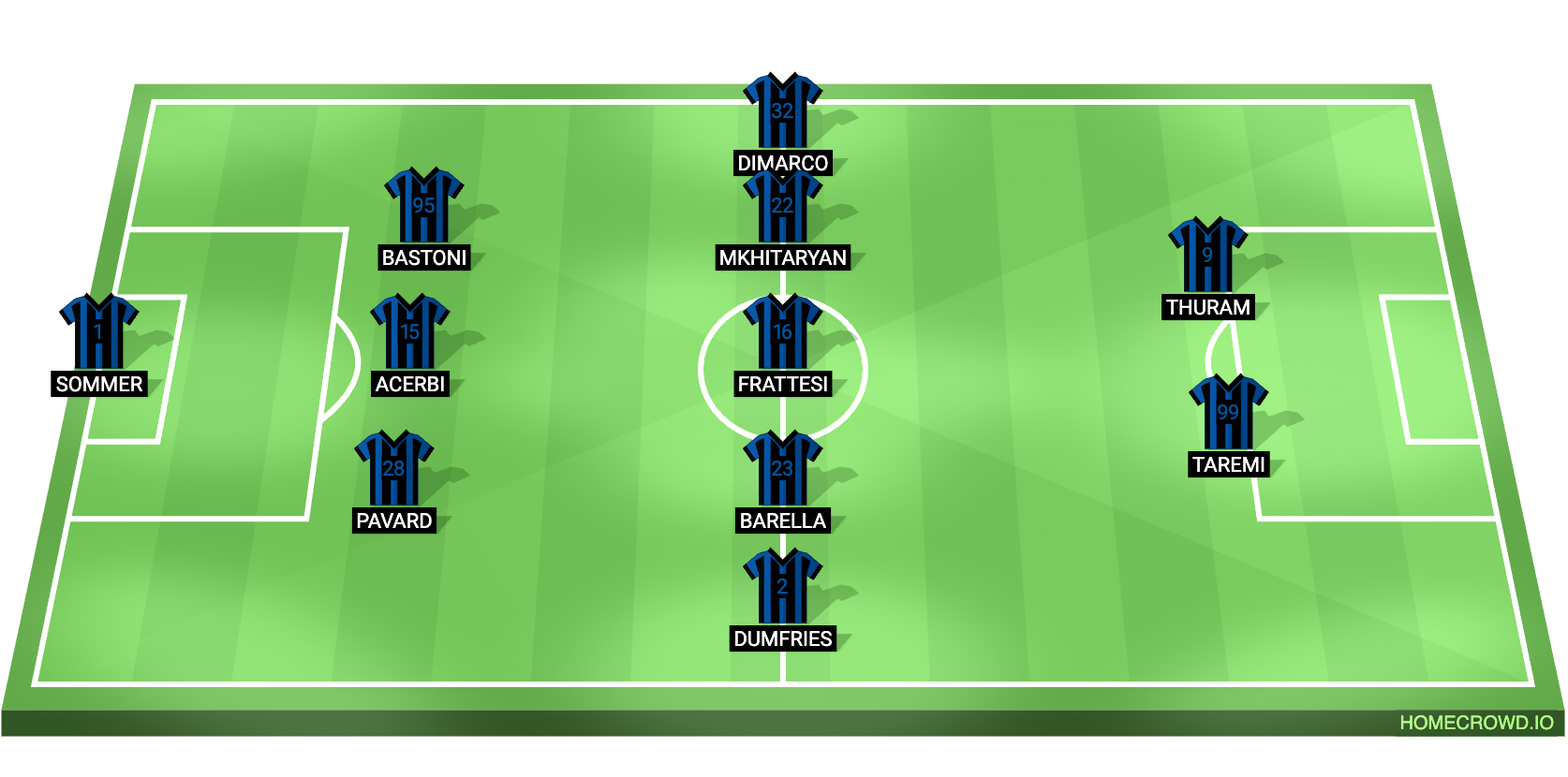 Matteo Darmian and Federico Dimarco will start as the wing-backs. They will look to contribute at both ends of the pitch. Davide Frattesi, Nicolo Barella, and Henrikh Mkhitaryan will add control, creativity, and defensive cover to the side from the middle of the park.