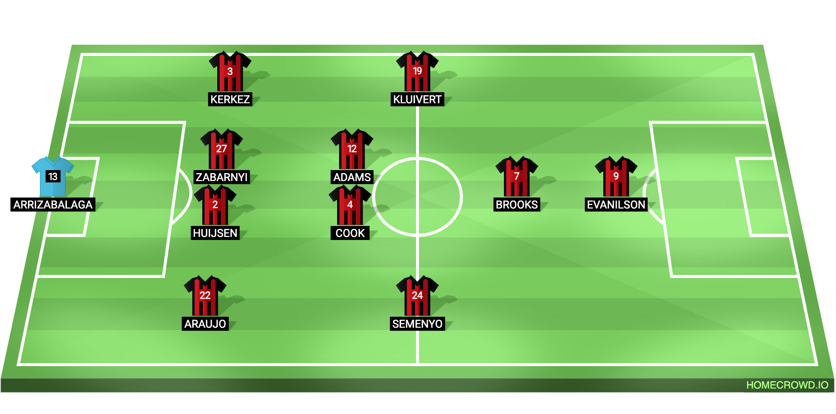 Probable Lineup (4-2-3-1): Kepa; Araujo, Zabarrnyi, Huijsen, Kerkez; Adams, Cook; Semenyo, Brooks, Kluivert; Evanilson