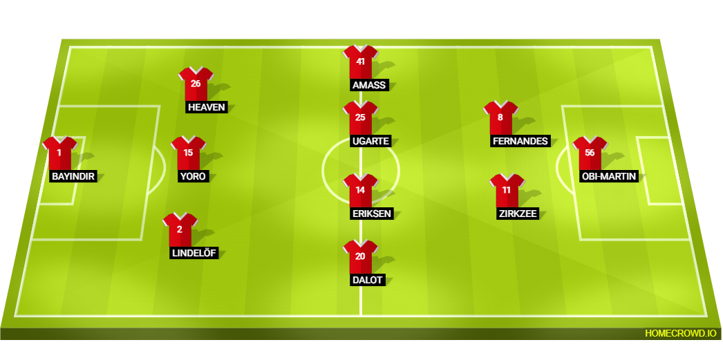 Probable Lineup (3-4-2-1): Bayindir; Lindelof, Yoro, Heaven; Dalot, Eriksen, Ugarte, Amass; Zirkzee, Bruno Fernandes; Obi-Martin