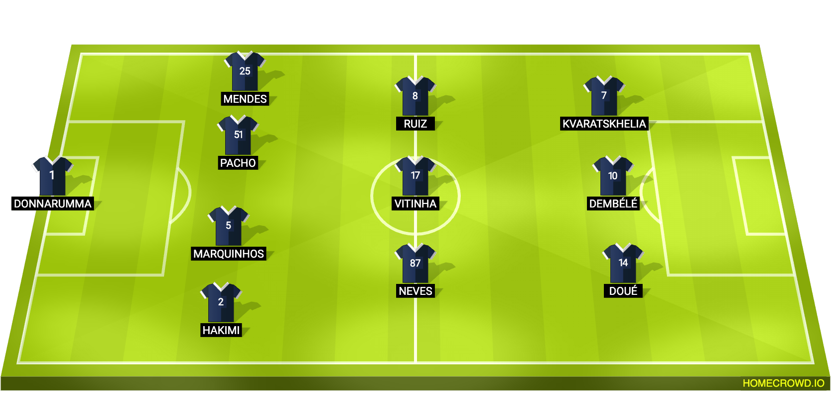 Probable Lineup (4-3-3): Donnarumma; Hakimi, Marquinhos, Pacho, Mendes; Neves, Vitinha, Ruiz; Doue, Dembele, Kvaratskhelia