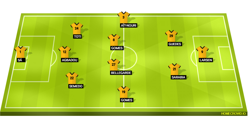 Probable Lineup (3-4-2-1): Bentley; Semedo, Agbadou, Toti Gomes; Rodrigo Gomes, Bellegarde, Joao Gomes, Ait Nouri; Sarabia, Guedes; Strand Larsen