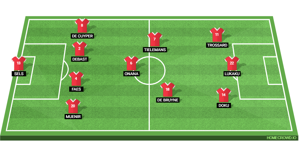 Probable Lineup (4-3-3): Sels; Meunier, Faes, Debast, De Cuyper; Onana, Tielemans, De Bruyne; Trossard, Lukaku, Doku